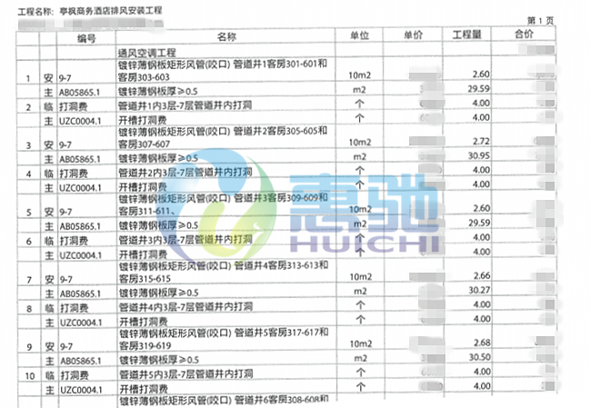 酒店排風(fēng)改造部分作業(yè)明細(xì)單