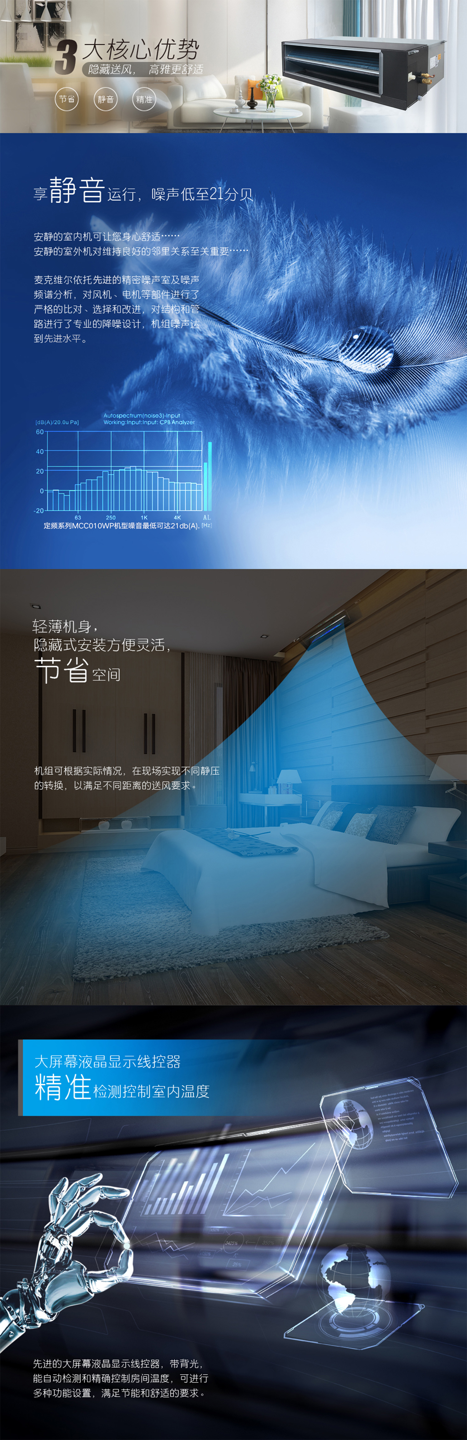 產(chǎn)品理念:采用變頻科技,讓機組時刻處于高效的工作狀態(tài)。應(yīng)用窄型結(jié)構(gòu)設(shè)計,大幅度節(jié)約安裝所用空間,可與各類裝修風(fēng)格融合。依托于精密噪音實驗室和先進的多通道噪聲分析模擬軟件,通過結(jié)構(gòu)和控制邏輯的優(yōu)化創(chuàng)新,針對性的對室內(nèi)機噪聲源進行遏制和隔斷,打造安靜的室內(nèi)空間。