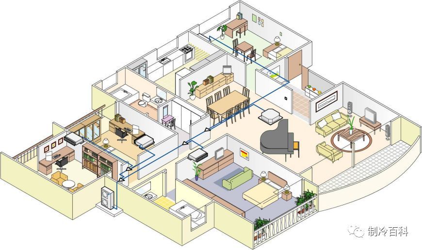 相對(duì)于其他類型的家用中央空調(diào),風(fēng)管系統(tǒng)中央空調(diào)雖然初投資小,引入新風(fēng)可有效改善室內(nèi)的空氣品質(zhì),但風(fēng)管系統(tǒng)的空氣輸配系統(tǒng)所需的建筑空間較大,一般要求住宅有較高的層高,同時(shí)它后期運(yùn)行噪音較大,運(yùn)行費(fèi)用高,因此針對(duì)家庭一般不推薦此類系統(tǒng)。