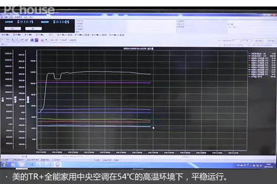 【高溫時的制冷效果】在溫度為54℃的高溫環境實驗室當中,開啟美的TR+全能家用中央空調,制冷約30分鐘。監測結果,美的TR+全能家用中央空調的制冷能力能維持在平穩的水平,說明其在54℃的高溫環境下,平穩運行,性能更加穩定。