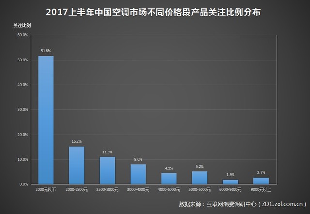 2017年上半年中國(guó)空調(diào)市場(chǎng)不同價(jià)格段產(chǎn)品關(guān)注比例分布
