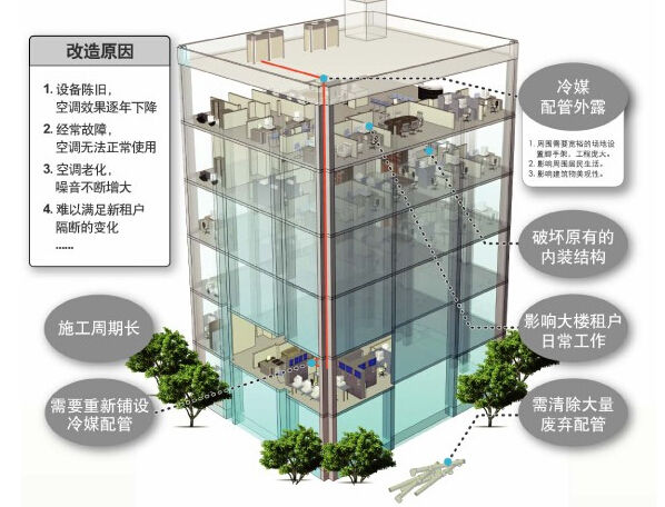 隨著空調(diào)使用年限的增加,很多產(chǎn)品運(yùn)行至今已經(jīng)接近10年。空調(diào)問題開始凸顯,比如故障率頻發(fā)、小毛病不斷、壓縮機(jī)燒機(jī)率增高、維保費(fèi)用逐漸增加、耗能嚴(yán)重、空調(diào)負(fù)荷無法滿足人們需要等,很多用戶亟待進(jìn)行改造。
